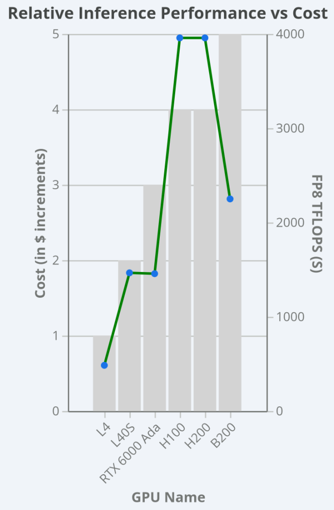 As the chart illustrates, the performance curve is not linear with cost. The L4 provides an accessible entry point for efficient and scalable inference. The L40S and RTX 6000 occupy a sweet spot, providing a significant performance leap for a moderate cost increase. The H100 and H200 represent the peak of the Hopper architecture, delivering maximum performance at a premium, with the H200’s value coming from its enhanced memory for massive models. The B200, although it has lower FP8 performance than Hopper, introduces new, more efficient data types, such as FP4, and is priced for next-generation, exascale workloads.